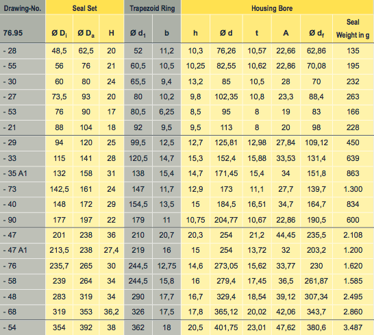 76.95型相對于76.90H和76.97H型,需要的安裝空間較小,對應(yīng)溝槽的形狀更易于加工,但是,該系列的密封所對應(yīng)的溝槽具有更高的加工精度要求。由于梯型橡膠圈與O型橡膠圈的壓縮形變不同,必須嚴(yán)格安照所規(guī)定的壓縮尺寸和間隙進(jìn)行安裝。如果間隙過小,有可能導(dǎo)致密封面冷焊,如果間隙過大,則有可能導(dǎo)致漏油。同時,加工尺寸的偏差也會影響橡膠圈的彈性儲備,縮短使用壽命。
